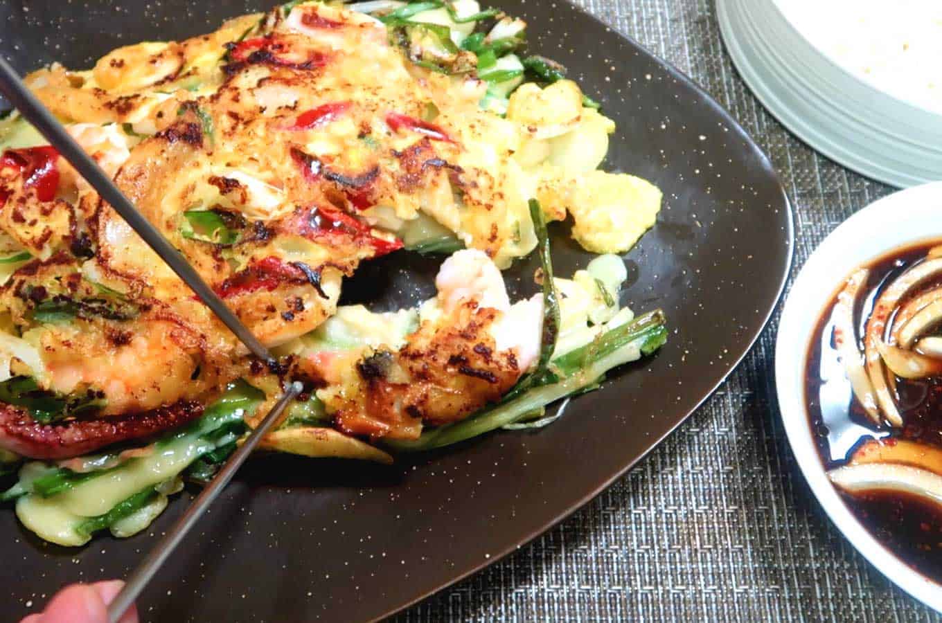 Serve the seafood pancake hot with a side of soy sauce for dipping.